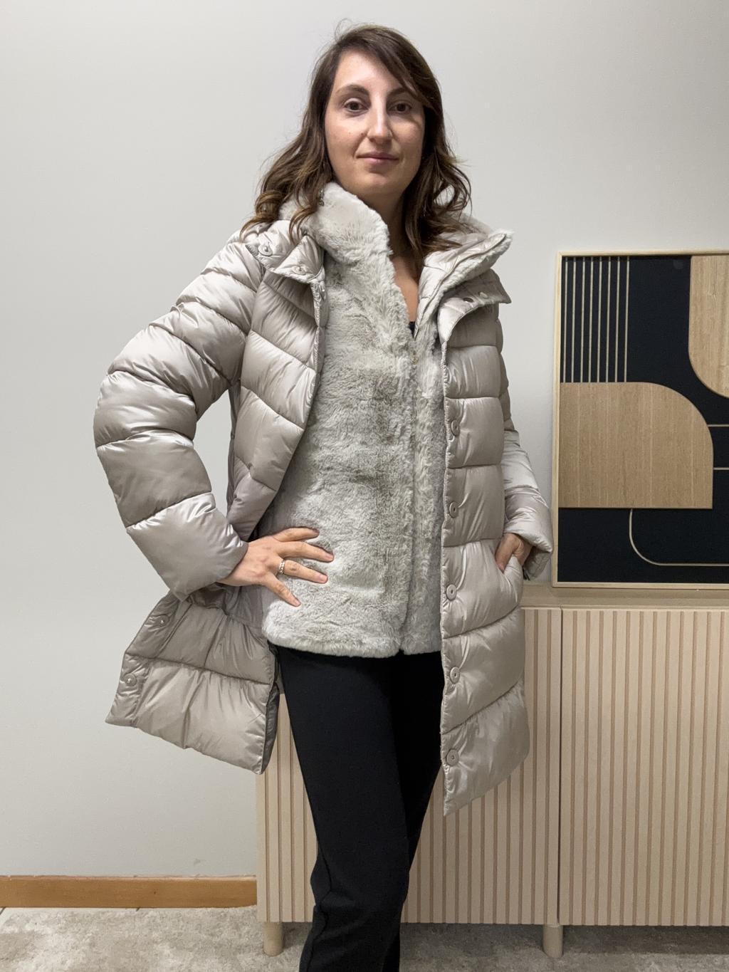 Giaccone in piuma d'oca, lunghezza al polpaccio. Cappuccio fisso. Chiusura con zip e bottoni a pressione su tutta la lunghezza. Tasca con zip laterale . Vestibilita' sfiancata. Unica variante colore antracite. Composizione : tessuto 100% poliamide, imbottitura piumino.
