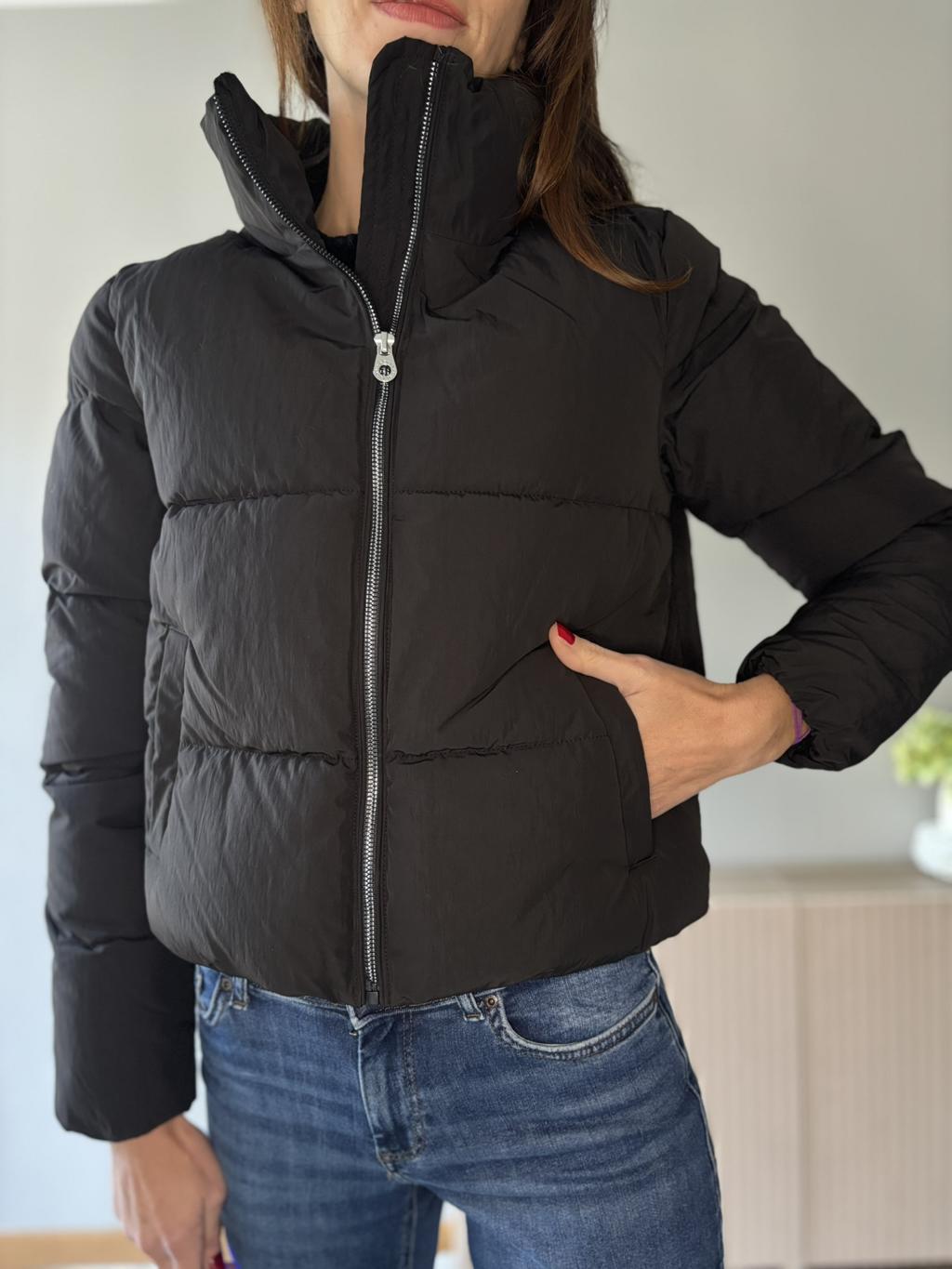 Ecopelliccia REVERSIBILE, da un lato imbottitura e dall'altro peluches, con cappuccio, chiusura a zip dorata e dettaglio di nastro. Vestibilità dritta sul fondo, lunghezza al fianco. Manica lunga a trombetta. Composizione 100% poliestere Unica variante colore nero.